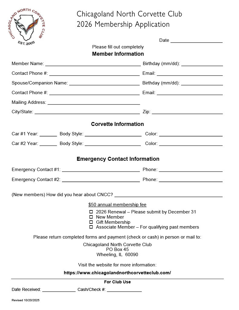 Or, for more information, please contact our Membership Chairperson at Membership@ChicagolandNorthCorvetteClub.com